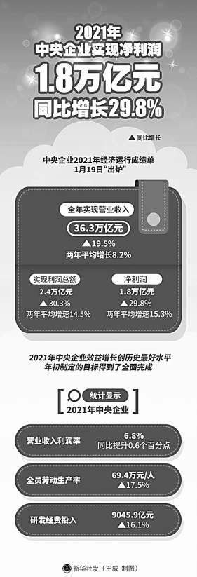 數(shù)據(jù)顯示,2021年,中央企業(yè)實(shí)現(xiàn)營(yíng)業(yè)收入36.3萬億元,同比增長(zhǎng)19.5%;實(shí)現(xiàn)利潤(rùn)總額2.4萬億元,同比增長(zhǎng)30.3%;實(shí)現(xiàn)凈利潤(rùn)1.8萬億元,同比增長(zhǎng)29.8%,均創(chuàng)歷史最好水平。中央企業(yè)全員勞動(dòng)生產(chǎn)率人均達(dá)到69.4萬元,同比增長(zhǎng)17.5%;百元營(yíng)業(yè)收入支付的成本費(fèi)用為94元,同比下降0.9元;年末資產(chǎn)負(fù)債率為64.9%,圓滿完成控制在65%以下的目標(biāo)。