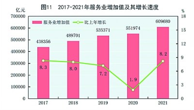 全年批發(fā)和零售業(yè)增加值110493億元,比上年增長11.3%;交通運(yùn)輸、倉儲和郵政業(yè)增加值47061億元,增長12.1%;住宿和餐飲業(yè)增加值17853億元,增長14.5%;金融業(yè)增加值91206億元,增長4.8%;房地產(chǎn)業(yè)增加值77561億元,增長5.2%;信息傳輸、軟件和信息技術(shù)服務(wù)業(yè)增加值43956億元,增長17.2%;租賃和商務(wù)服務(wù)業(yè)增加值35350億元,增長6.2%。全年規(guī)模以上服務(wù)業(yè)企業(yè)營業(yè)收入比上年增長18.7%,利潤總額增長13.4%。(見圖11)