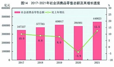 全年社會消費(fèi)品零售總額440823億元,比上年增長12.5%。按經(jīng)營地統(tǒng)計,城鎮(zhèn)消費(fèi)品零售額381558億元,增長12.5%;鄉(xiāng)村消費(fèi)品零售額59265億元,增長12.1%。按消費(fèi)類型統(tǒng)計,商品零售額393928億元,增長11.8%;餐飲收入額46895億元,增長18.6%。(見圖14)