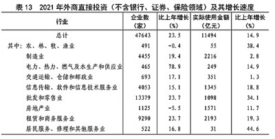 全年外商直接投資(不含銀行、證券、保險領(lǐng)域)新設(shè)立企業(yè)47643家,比上年增長23.5%。實(shí)際使用外商直接投資金額11494億元,增長14.9%,折1735億美元,增長20.2%。其中“一帶一路”沿線國家對華直接投資(含通過部分自由港對華投資)新設(shè)立企業(yè)5336家,增長24.3%;對華直接投資金額743億元,增長29.4%,折112億美元,增長36.0%。全年高技術(shù)產(chǎn)業(yè)實(shí)際使用外資3469億元,增長17.1%,折522億美元,增長22.1%。(見表13)