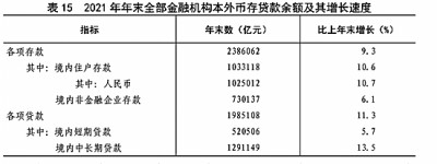 全年社會融資規(guī)模增量[45]31.4萬億元,按可比口徑計算,比上年少3.4萬億元。年末社會融資規(guī)模存量[46]314.1萬億元,按可比口徑計算,比上年末增長10.3%,其中對實(shí)體經(jīng)濟(jì)發(fā)放的人民幣貸款余額191.5萬億元,增長11.6%。年末全部金融機(jī)構(gòu)本外幣各項存款余額238.6萬億元,比年初增加20.2萬億元,其中人民幣各項存款余額232.3萬億元,增加19.7萬億元。全部金融機(jī)構(gòu)本外幣各項貸款余額198.5萬億元,增加20.1萬億元,其中人民幣各項貸款余額192.7萬億元,增加19.9萬億元。人民幣普惠金融貸款[47]余額26.5萬億元,增加5.0萬億元。(見表15)