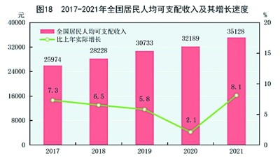 全年全國居民人均可支配收入35128元,比上年增長9.1%,扣除價格因素,實(shí)際增長8.1%。全國居民人均可支配收入中位數(shù)[53]29975元,增長8.8%。按常住地分,城鎮(zhèn)居民人均可支配收入47412元,比上年增長8.2%,扣除價格因素,實(shí)際增長7.1%。城鎮(zhèn)居民人均可支配收入中位數(shù)43504元,增長7.7%。農(nóng)村居民人均可支配收入18931元,比上年增長10.5%,扣除價格因素,實(shí)際增長9.7%。農(nóng)村居民人均可支配收入中位數(shù)16902元,增長11.2%。城鄉(xiāng)居民人均可支配收入比值為2.50,比上年縮小0.06。按全國居民五等份收入分組[54],低收入組人均可支配收入8333元,中間偏下收入組人均可支配收入18445元,中間收入組人均可支配收入29053元,中間偏上收入組人均可支配收入44949元,高收入組人均可支配收入85836元。全國農(nóng)民工人均月收入4432元,比上年增長8.8%。全年脫貧縣[55]農(nóng)村居民人均可支配收入14051元,比上年增長11.6%,扣除價格因素,實(shí)際增長10.8%。