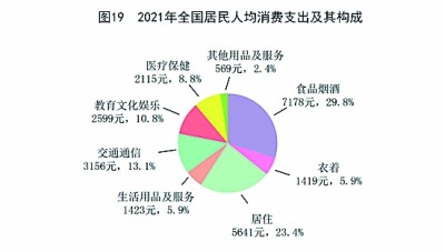 全年全國居民人均消費(fèi)支出24100元,比上年增長13.6%,扣除價格因素,實(shí)際增長12.6%。其中,人均服務(wù)性消費(fèi)支出[56]10645元,比上年增長17.8%,占居民人均消費(fèi)支出的比重為44.2%。按常住地分,城鎮(zhèn)居民人均消費(fèi)支出30307元,增長12.2%,扣除價格因素,實(shí)際增長11.1%;農(nóng)村居民人均消費(fèi)支出15916元,增長16.1%,扣除價格因素,實(shí)際增長15.3%。全國居民恩格爾系數(shù)為29.8%,其中城鎮(zhèn)為28.6%,農(nóng)村為32.7%。(見圖18)(見圖19)