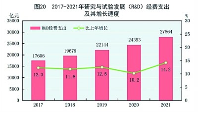 全年研究與試驗發(fā)展(R&D)經(jīng)費(fèi)支出27864億元,比上年增長14.2%,與國內(nèi)生產(chǎn)總值之比為2.44%,其中基礎(chǔ)研究經(jīng)費(fèi)1696億元。國家自然科學(xué)基金共資助4.87萬個項目。截至年末,正在運(yùn)行的國家重點(diǎn)實(shí)驗室533個,納入新序列管理的國家工程研究中心191個,國家企業(yè)技術(shù)中心1636家,大眾創(chuàng)業(yè)萬眾創(chuàng)新示范基地212家。國家科技成果轉(zhuǎn)化引導(dǎo)基金累計設(shè)立36支子基金,資金總規(guī)模624億元。國家級科技企業(yè)孵化器[60]1287家,國家備案眾創(chuàng)空間[61]2551家。全年授予專利權(quán)460.1萬件,比上年增長26.4%;PCT專利申請受理量[62]7.3萬件。截至年末,有效專利1542.1萬件,其中境內(nèi)有效發(fā)明專利270.4萬件。每萬人口高價值發(fā)明專利擁有量[63]7.5件。全年商標(biāo)注冊773.9萬件,比上年增長34.3%。全年共簽訂技術(shù)合同67萬項,技術(shù)合同成交金額37294億元,比上年增長32.0%。(見圖20)(見表16)