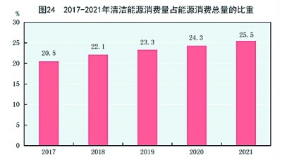 初步核算,全年能源消費(fèi)總量52.4億噸標(biāo)準(zhǔn)煤,比上年增長5.2%。煤炭消費(fèi)量增長4.6%,原油消費(fèi)量增長4.1%,天然氣消費(fèi)量增長12.5%,電力消費(fèi)量增長10.3%。煤炭消費(fèi)量占能源消費(fèi)總量的56.0%,比上年下降0.9個百分點(diǎn);天然氣、水電、核電、風(fēng)電、太陽能發(fā)電等清潔能源消費(fèi)量占能源消費(fèi)總量的25.5%,上升1.2個百分點(diǎn)。重點(diǎn)耗能工業(yè)企業(yè)單位電石綜合能耗下降5.3%,單位合成氨綜合能耗與上年持平,噸鋼綜合能耗下降0.4%,單位電解鋁綜合能耗下降2.1%,每千瓦時火力發(fā)電標(biāo)準(zhǔn)煤耗下降0.5%。全國萬元國內(nèi)生產(chǎn)總值二氧化碳排放[78]下降3.8%。(見圖24)