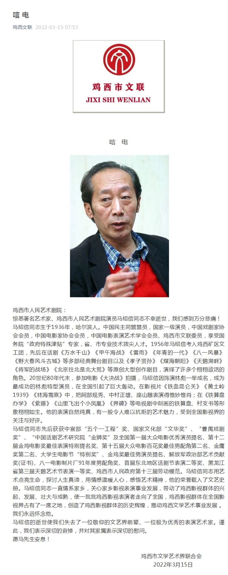 中新網(wǎng)3月16日電 據(jù)“雞西文聯(lián)”微信公眾號(hào)消息,著名藝術(shù)家、黑龍江省雞西市人民藝術(shù)劇院演員馬紹信去世,享年86歲。馬紹信是國家一級(jí)演員、中國戲劇家協(xié)會(huì)會(huì)員、中國電影家協(xié)會(huì)會(huì)員,曾參與電影《大決戰(zhàn)》拍攝,一舉成名。其代表作還包括《林海雪原》《鐵血昆侖關(guān)》等。