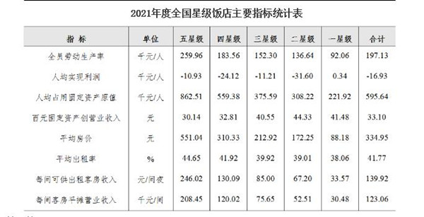 根據(jù)“2021年度全國(guó)星級(jí)飯店主要指標(biāo)統(tǒng)計(jì)表 ”,平均房?jī)r(jià)為334.95元,每間可供出租客房收入為139.92元/間夜,每間客房平攤營(yíng)收為123.06千元/間。