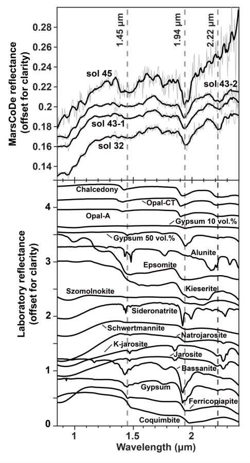 劉洋研究員和合作者通過對祝融號火星表面成分探測器獲取的短波紅外光譜和導(dǎo)航與地形相機(jī)數(shù)據(jù)進(jìn)行分析,發(fā)現(xiàn)了一種形貌上類似沉積巖的巖石類型——板狀的亮色巖石。這些板狀巖石通常部分被灰塵和土壤覆蓋,顯示出剝落的表面,表明受到熱應(yīng)力和風(fēng)成作用的物理風(fēng)化。研究人員利用短波紅外光譜在這些亮色板狀巖石中探測到了之前軌道數(shù)據(jù)在該區(qū)域沒有識別到的含水礦物,這些光譜具有~1.9μm和~2.2μm吸收特征,推測其為含水硅或含水硫酸鹽。