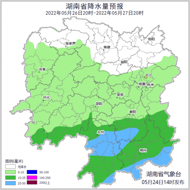 近期湖南雨水不休,湘中、湘南降雨偏多,陰雨日數(shù)多,累積雨量大。其中24日,湘南局地暴雨,25日至27日降雨范圍擴(kuò)大,強(qiáng)度減弱,全省大部有小到中雨,湘南和湘中局地大雨。氣溫呈穩(wěn)步回升態(tài)勢(shì)。