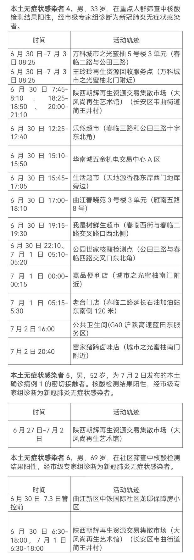 7月3日0-24時,西安新增3例本土無癥狀感染者,2例在重點人群核酸檢測中發(fā)現(xiàn),1例在社區(qū)篩查中發(fā)現(xiàn)。主要活動軌跡如下:
