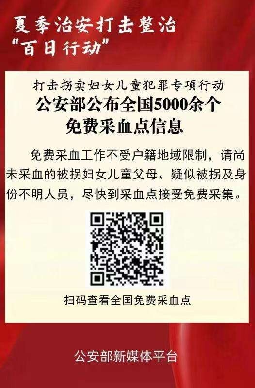 公安部公布全國(guó)5000余個(gè)免費(fèi)采血點(diǎn)信息 助力被拐家庭早日實(shí)現(xiàn)團(tuán)圓 免費(fèi)采血工作不受戶(hù)籍地域限制