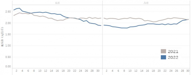 從價格走勢看(圖1),呈現(xiàn)三個特點:一是整體處于低價區(qū)間。6月是我國露地蔬菜生產旺季,全國平均氣溫、平均降水量較常年同期偏高,平均日照時數(shù)較2021年偏多,整體有利于蔬菜生產,供應較為充足,月均地頭價環(huán)比、同比均呈下降態(tài)勢。二是月內上旬呈下降趨勢。6月9日蔬菜地頭價1.78元/公斤,較月初1.90元/公斤下降了6.3%,跌至2022年以來的最低點,比年內最高價(4.21元/公斤)下降57.7%。三是中下旬價格止跌回升。經歷6月10—16日和26—30日兩輪較大幅度上漲,月末價格達到2.16元/公斤,比6月9日價格上升了21.3%。上漲主要原因:一方面,黃淮海及環(huán)渤海等地區(qū)因持續(xù)高溫天氣,設施蔬菜提前拉秧,供應量減少。另一方面,南方持續(xù)降雨影響蔬菜正常生長和采收,江西、湖南、廣西、福建等省部分地區(qū)發(fā)生不同程度洪澇災害,100多萬畝蔬菜受災。此外,受疫情影響的社會性消費開始復蘇,蔬菜需求量增加。