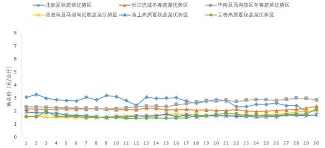 6月中后期地頭價從主產區(qū)看(圖2),除云貴高原夏秋蔬菜優(yōu)勢區(qū)月均地頭價環(huán)比持平外,其他優(yōu)勢區(qū)地頭價均有所下降,其中北部產區(qū)降幅相對較大。黃土高原夏秋蔬菜優(yōu)勢區(qū)、黃淮海及環(huán)渤海設施蔬菜優(yōu)勢區(qū)、北部夏秋蔬菜優(yōu)勢區(qū)、長江流域冬春蔬菜優(yōu)勢區(qū)、華南及西南熱區(qū)冬春蔬菜優(yōu)勢區(qū)6月月均地頭價環(huán)比分別下降了31.7%、19.3%、18.5%、17.8%、6.6%。