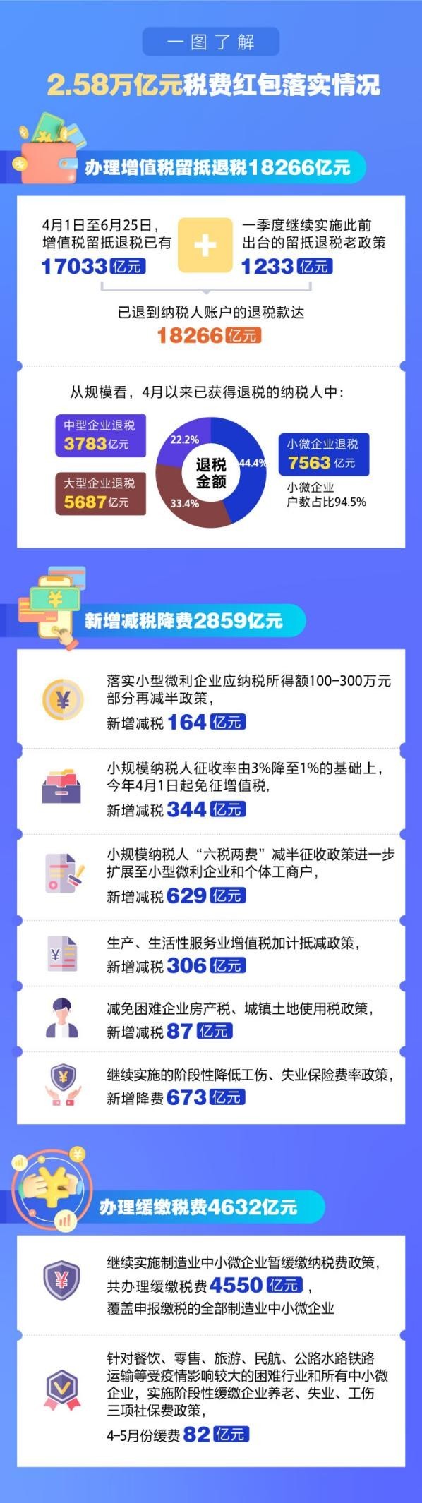 國家稅務(wù)總局數(shù)據(jù)顯示,截至6月25日,新的組合式稅費支持政策累計新增退稅減稅降費及緩稅緩費約2.58萬億元。預(yù)計上半年新的組合式稅費支持政策將新增退稅減稅降費及緩稅緩費約2.86萬億元。