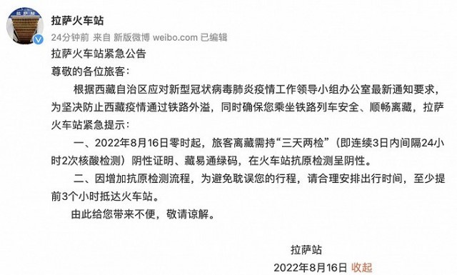 央視網(wǎng)消息:據(jù)@拉薩火車站 微博消息,根據(jù)西藏自治區(qū)應(yīng)對(duì)新型冠狀病毒肺炎疫情工作領(lǐng)導(dǎo)小組辦公室最新通知要求,為堅(jiān)決防止西藏疫情通過鐵路外溢,同時(shí)確保您乘坐鐵路列車安全、順暢離藏,拉薩火車站緊急提示:8月16日零時(shí)起,旅客離藏需持“三天兩檢”(即連續(xù)3日內(nèi)間隔24小時(shí)2次核酸檢測)陰性證明、藏易通綠碼,在火車站抗原檢測呈陰性。因增加抗原檢測流程,請(qǐng)至少提前3個(gè)小時(shí)抵達(dá)火車站。