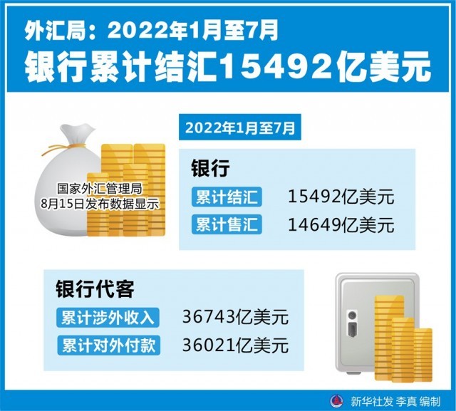 新華社北京8月15日電(記者劉開雄)國(guó)家外匯管理局15日發(fā)布數(shù)據(jù)顯示,今年1月至7月,銀行累計(jì)結(jié)匯15492億美元,累計(jì)售匯14649億美元;銀行代客累計(jì)涉外收入36743億美元,累計(jì)對(duì)外付款36021億美元。