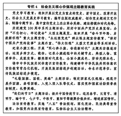 持續(xù)深化社會主義核心價值觀宣傳教育,增進認知認同、樹立鮮明導(dǎo)向、強化示范帶動。堅持貫穿結(jié)合融入、落細落小落實,把社會主義核心價值觀要求融入日常生活,融入法治建設(shè)。推動理想信念教育常態(tài)化制度化,筑牢黨員干部、青少年等重點群體的理想信念之基。圍繞“七一”、“八一”、“十一”等重大時間節(jié)點,依托革命歷史類紀(jì)念設(shè)施、遺址和愛國主義教育基地等載體,加強愛國主義、集體主義、社會主義教育,弘揚黨和人民在各個歷史時期奮斗中形成的偉大精神。加強公益廣告宣傳。統(tǒng)籌開展誠信教育、勤儉節(jié)約教育、勞動創(chuàng)造幸福主題宣傳教育。強化祖國統(tǒng)一和民族團結(jié)進步宣傳教育,深化“一國兩制”實踐教育,強化全民國防教育,促進平安中國建設(shè)。