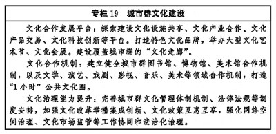 加強區(qū)域文化協(xié)同創(chuàng)新,健全合作互助、扶持補償機制,推動?xùn)|部地區(qū)以創(chuàng)新引領(lǐng)文化發(fā)展,加大力度支持中西部地區(qū)以及東北等老工業(yè)基地文化發(fā)展,扶持革命老區(qū)、民族地區(qū)、邊疆地區(qū)文化發(fā)展,形成相互促進、優(yōu)勢互補、融合互動的區(qū)域文化發(fā)展格局。圍繞京津冀協(xié)同發(fā)展、長江經(jīng)濟帶發(fā)展、粵港澳大灣區(qū)建設(shè)、長三角一體化發(fā)展、黃河流域生態(tài)保護和高質(zhì)量發(fā)展等區(qū)域重大戰(zhàn)略,健全推進區(qū)域內(nèi)文化協(xié)同發(fā)展機制,提升公共文化設(shè)施互聯(lián)互通水平,加強區(qū)域文化產(chǎn)業(yè)帶建設(shè),實現(xiàn)區(qū)域文化建設(shè)水平整體提高。促進形成文化產(chǎn)業(yè)發(fā)展新格局,創(chuàng)新城市群文化一體化發(fā)展體制機制,共建高水平合作平臺,加強公共文化服務(wù)便利共享。完善以城帶鄉(xiāng)、城鄉(xiāng)融合的文化發(fā)展體制機制,發(fā)揮城市帶動輻射作用,加快城鄉(xiāng)間文化要素雙向流動,形成以點帶面、特色鮮明、優(yōu)勢互補、均衡配置的城鄉(xiāng)文化發(fā)展新格局。