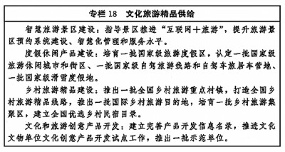 適應(yīng)大眾旅游時代新要求,推進旅游為民,推動構(gòu)建類型多樣、分布均衡、特色鮮明、品質(zhì)優(yōu)良的旅游供給體系,推動文化和旅游業(yè)態(tài)融合、產(chǎn)品融合、市場融合。提升旅游演藝、文化遺產(chǎn)旅游、文化主題酒店、特色節(jié)慶展會等品質(zhì),支持建設(shè)集文化創(chuàng)意、旅游休閑等于一體的文化和旅游綜合體。依托革命博物館、黨史館、紀(jì)念館、革命遺址遺存遺跡等,打造紅色旅游經(jīng)典景區(qū)和經(jīng)典線路。利用鄉(xiāng)村文化傳統(tǒng)和資源,發(fā)展鄉(xiāng)村旅游。加強對當(dāng)代社會主義建設(shè)成就的旅游開發(fā),深入挖掘重大工程項目的精神內(nèi)涵,發(fā)展特色旅游。加強對工業(yè)遺產(chǎn)資源的活化利用,開發(fā)旅游用品、特色旅游商品,培育旅游裝備制造業(yè),發(fā)展工業(yè)旅游。推動旅游與現(xiàn)代生產(chǎn)生活有機結(jié)合,加快發(fā)展度假休閑旅游、康養(yǎng)旅游、研學(xué)實踐活動等,打造一批國家全域旅游示范區(qū)、A級旅游景區(qū)、國家級旅游度假區(qū)、國家精品旅游帶、國家旅游風(fēng)景道、特色旅游目的地、特色旅游功能區(qū)、城市綠道、騎行公園和慢行系統(tǒng)。大力發(fā)展智慧旅游,推進智慧景區(qū)、度假區(qū)建設(shè)。