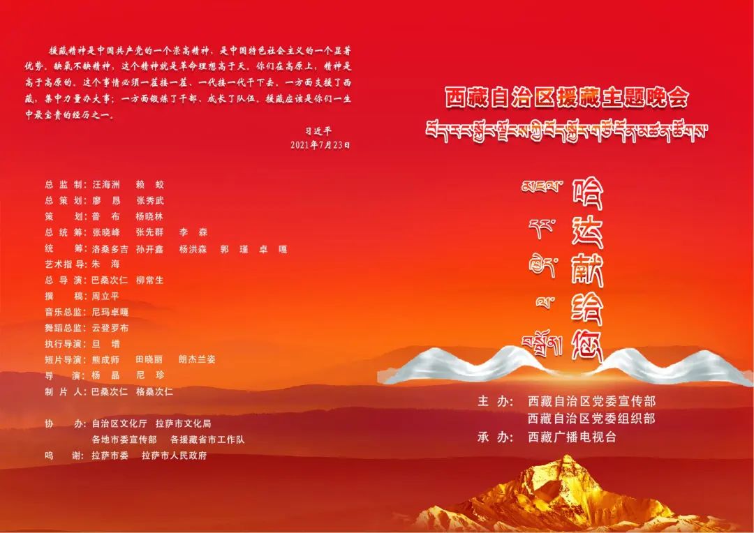為展現(xiàn)援藏工作成就,弘揚援藏精神,表達西藏各族干部群眾對習近平總書記和黨中央的親切關懷、全國人民無私支援特別是對援藏干部人才的敬意和感恩之情,由自治區(qū)黨委宣傳部、自治區(qū)黨委組織部共同主辦的援藏主題晚會《哈達獻給您》將于8月18日晚,在西藏衛(wèi)視(《西藏新聞聯(lián)播》后)、西藏藏語衛(wèi)視(19:30左右)播出,自治區(qū)七地市廣播電視臺將同步播出(地市《新聞聯(lián)播》后)。