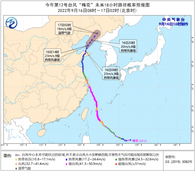 臺(tái)風(fēng)“梅花”未來24小時(shí)路徑概率預(yù)報(bào)圖(2022年9月16日8時(shí)至17日2時(shí)) 來源:中央氣象臺(tái)