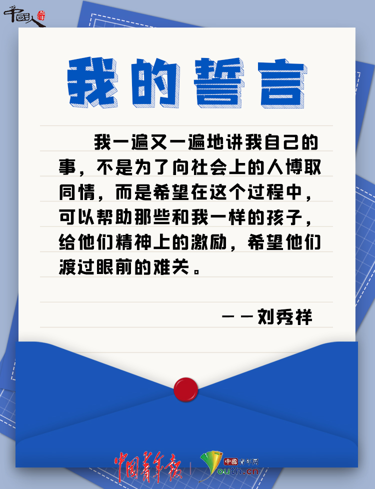 他說:“我一遍又一遍地講我自己的事,不是為了向社會上的人博取同情,而是希望在這個過程中,可以幫助那些和我一樣的孩子,給他們精神上的激勵,希望他們渡過眼前的難關?!?/p>