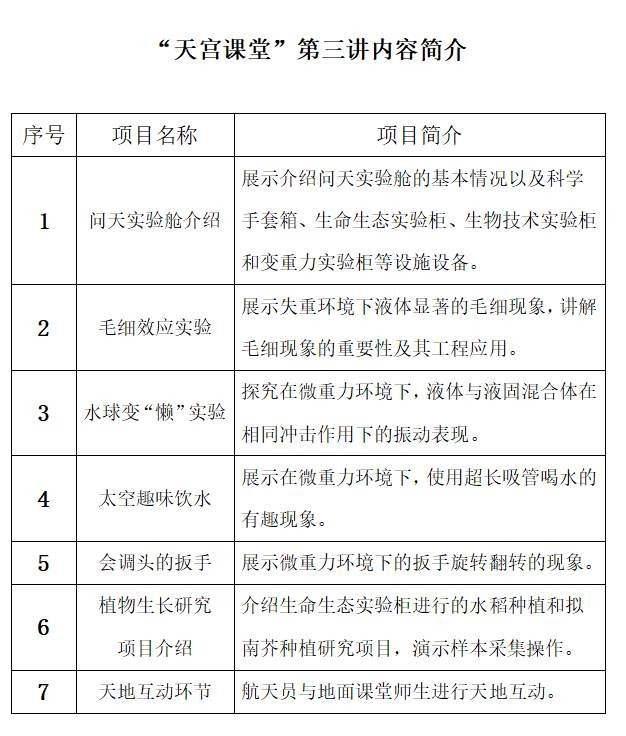 本次太空授課活動將繼續(xù)采取天地互動方式進行,3名航天員將在軌介紹展示中國空間站問天實驗艙工作生活場景,演示微重力環(huán)境下毛細效應(yīng)實驗、水球變“懶”實驗、太空趣味飲水、會調(diào)頭的扳手以及植物生長研究項目介紹,并與地面課堂進行互動交流,旨在傳播普及載人航天知識,激發(fā)廣大青少年對科學(xué)的興趣。