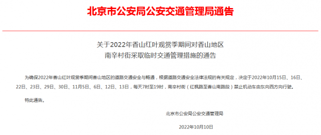 北京市交管局網(wǎng)站發(fā)布通告,為確保今年香山紅葉觀賞季期間的道路交通安全與暢通,10月15日、16日、22日、23日、29日、30日、11月5日、6日、12日、13日,每天7時(shí)至19時(shí),南辛村街(紅楓路至香山南路段)禁止機(jī)動(dòng)車(chē)由東向西方向行駛。