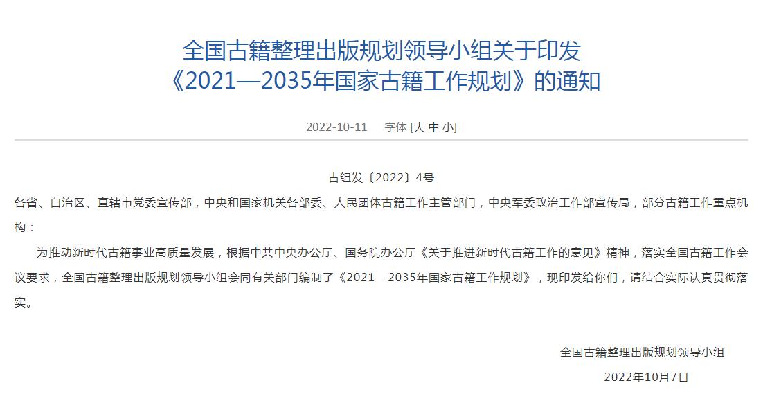 通知表示,要堅持系統(tǒng)觀念,以重大工程為引領(lǐng),加強(qiáng)古籍工作全局性謀劃、戰(zhàn)略性布局和整體性推進(jìn)。強(qiáng)化重大工程牽引,建立古籍重大工程專項(xiàng)協(xié)調(diào)機(jī)制,統(tǒng)籌實(shí)施若干重大工程,加強(qiáng)古籍工作各領(lǐng)域各環(huán)節(jié)協(xié)同配合,帶動重要古籍文獻(xiàn)系統(tǒng)性保護(hù)、整理、研究和出版。重點(diǎn)實(shí)施 《永樂大典》、敦煌文獻(xiàn)系統(tǒng)性保護(hù)整理出版工程,中華版本傳世工程 ( 古籍部分)和國家古籍?dāng)?shù)字化工程,充分發(fā)揮古籍在中華文明發(fā)展研究和新時代文化建設(shè)中的重要作用。