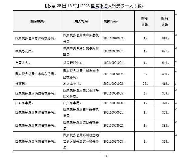 截至10月25日16時(shí),2023國(guó)考報(bào)名首日的“人氣之星”是國(guó)家稅務(wù)總局青海省稅務(wù)局曲麻萊縣稅務(wù)局這一職位,僅招錄1人,已有848人提交報(bào)名申請(qǐng),報(bào)名首日競(jìng)爭(zhēng)比已高達(dá)848:1。