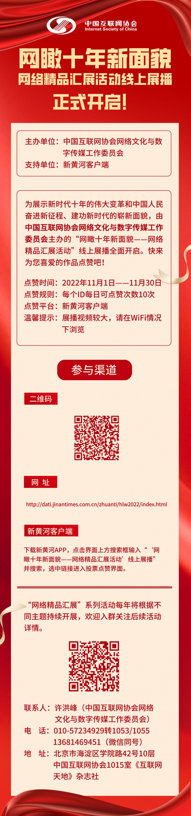 為展示新時代十年的偉大變革和中國人民奮進新征程、建功新時代的嶄新面貌,11月1日,由中國互聯(lián)網協(xié)會網絡文化與數(shù)字傳媒工作委員會(以下簡稱工作委員會)主辦的“網絡精品匯展”第三季“網瞰十年新面貌”網絡精品匯展活動線上展播啟動,在網絡空間唱響正能量。歡迎廣大網民點擊“閱讀原文”進入活動頁面為喜愛的作品點贊,展播時間截至11月30日。