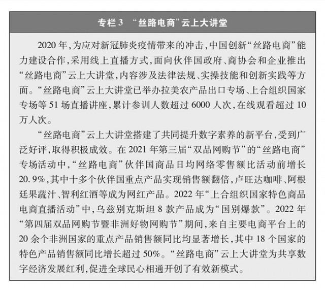 “絲路電商”合作成果豐碩。自2016年以來,中國與五大洲23個國家建立雙邊電子商務(wù)合作機制,建立中國-中東歐國家、中國-中亞五國電子商務(wù)合作對話機制,通過政企對話、聯(lián)合研究、能力建設(shè)等推動多層次交流合作,營造良好發(fā)展環(huán)境,構(gòu)建數(shù)字合作格局。電子商務(wù)企業(yè)加速“出?!?,帶動跨境物流、移動支付等各領(lǐng)域?qū)崿F(xiàn)全球發(fā)展。積極參與世界貿(mào)易組織、二十國集團、亞太經(jīng)合組織、金磚國家、上合組織等多邊和區(qū)域貿(mào)易機制下的電子商務(wù)議題討論,與自貿(mào)伙伴共同構(gòu)建高水平數(shù)字經(jīng)濟規(guī)則。電子商務(wù)國際規(guī)則構(gòu)建取得突破,區(qū)域全面經(jīng)濟伙伴關(guān)系協(xié)定電子商務(wù)章節(jié)成為目前覆蓋區(qū)域最廣、內(nèi)容全面、水平較高的電子商務(wù)國際規(guī)則。