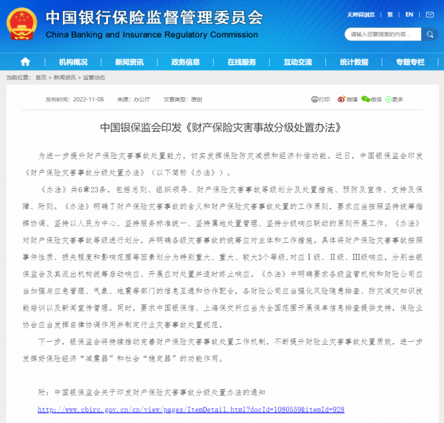 銀保監(jiān)會網(wǎng)站11月8日消息,為進一步提升財產(chǎn)保險災害事故處置能力,切實發(fā)揮保險防災減損和經(jīng)濟補償功能。近日,中國銀保監(jiān)會印發(fā)《財產(chǎn)保險災害事故分級處置辦法》(以下簡稱《辦法》)。