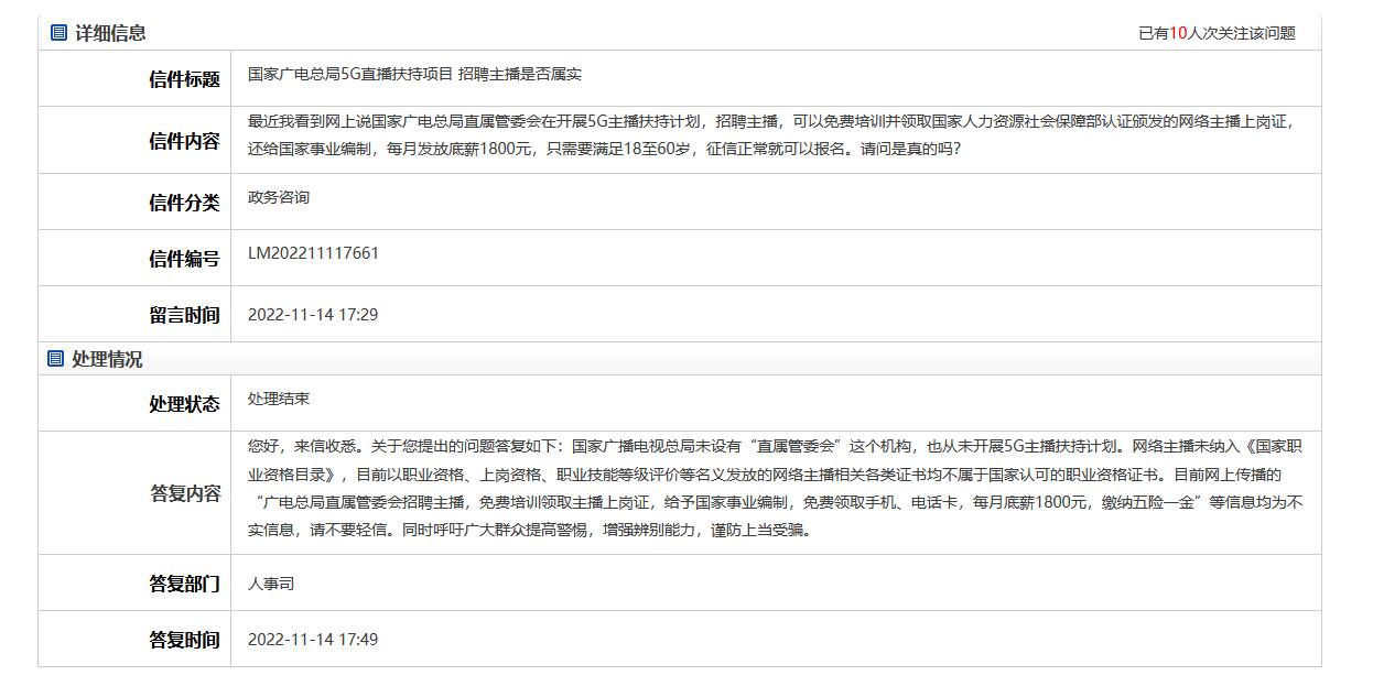 國(guó)家廣電總局人事司表示,網(wǎng)絡(luò)主播未納入《國(guó)家職業(yè)資格目錄》,目前以職業(yè)資格、上崗資格、職業(yè)技能等級(jí)評(píng)價(jià)等名義發(fā)放的網(wǎng)絡(luò)主播相關(guān)各類證書(shū)均不屬于國(guó)家認(rèn)可的職業(yè)資格證書(shū)。目前網(wǎng)上傳播的“廣電總局直屬管委會(huì)招聘主播,免費(fèi)培訓(xùn)領(lǐng)取主播上崗證,給予國(guó)家事業(yè)編制,免費(fèi)領(lǐng)取手機(jī)、電話卡,每月底薪1800元,繳納五險(xiǎn)一金”等信息均為不實(shí)信息。