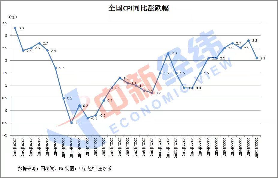國(guó)家統(tǒng)計(jì)局?jǐn)?shù)據(jù)顯示,2022年10月,全國(guó)CPI環(huán)比上漲0.1%,同比上漲2.1%。同比漲幅較9月明顯回落,且連續(xù)第4個(gè)月低于市場(chǎng)預(yù)期。