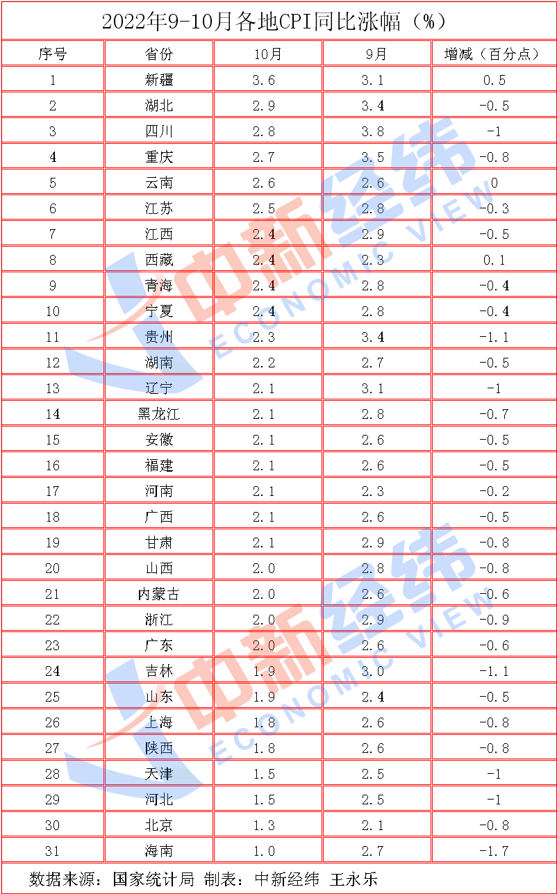 31省份10月CPI出爐:28地漲幅收窄,8地重回“1時(shí)代”