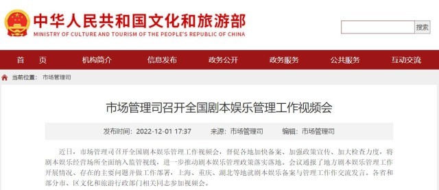 文旅部:將劇本娛樂經(jīng)營(yíng)場(chǎng)所全面納入監(jiān)管視線