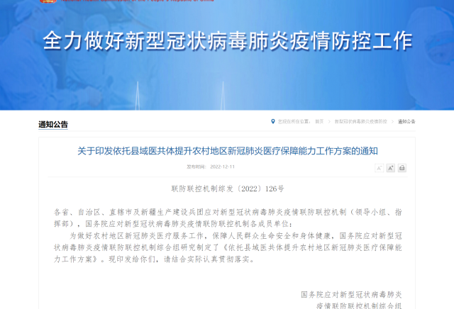 為做好農村地區(qū)新冠肺炎醫(yī)療服務工作,保障高齡合并基礎疾病等重癥風險較高的感染者及時救治,在農村地區(qū),以縣域醫(yī)共體為載體,提升縣級醫(yī)院重癥救治能力,發(fā)揮鄉(xiāng)鎮(zhèn)衛(wèi)生院和村衛(wèi)生室健康監(jiān)測作用,最大可能降低重癥率、病亡率,國務院聯(lián)防聯(lián)控機制11日發(fā)布《關于印發(fā)依托縣域醫(yī)共體提升農村地區(qū)新冠肺炎醫(yī)療保障能力工作方案的通知》(下稱“方案”)。