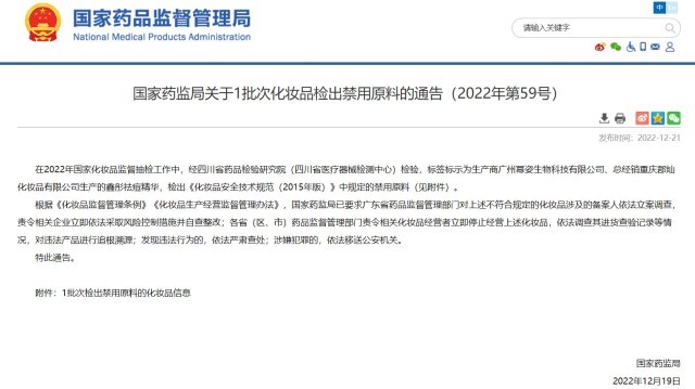 國家藥監(jiān)局官網(wǎng)消息,在2022年國家化妝品監(jiān)督抽檢工作中,經(jīng)四川省藥品檢驗(yàn)研究院(四川省醫(yī)療器械檢測中心)檢驗(yàn),標(biāo)簽標(biāo)示為生產(chǎn)商廣州冪姿生物科技有限公司、總經(jīng)銷重慶郡燦化妝品有限公司生產(chǎn)的鑫彤祛痘精華,檢出《化妝品安全技術(shù)規(guī)范(2015年版)》中規(guī)定的禁用原料。