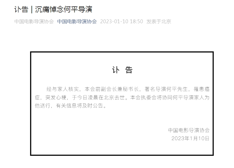 中新網(wǎng)1月10日電 據(jù)中國電影導(dǎo)演協(xié)會(huì)消息,經(jīng)與家人核實(shí),中國電影導(dǎo)演協(xié)會(huì)前副會(huì)長兼秘書長,著名導(dǎo)演何平先生,罹患癌癥,突發(fā)心梗,于1月10日凌晨在北京去世。中國電影導(dǎo)演協(xié)會(huì)執(zhí)委會(huì)將協(xié)同何平導(dǎo)演家人為他送行,有關(guān)信息將及時(shí)公告。