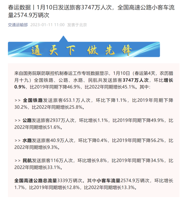 來自國務院聯(lián)防聯(lián)控機制春運工作專班數據顯示,1月10日(春運第4天,農歷臘月十九)全國鐵路、公路、水路、民航共發(fā)送旅客3747萬人次,環(huán)比增長0.9%,比2019年同期下降46.9%,比2022年同期增長45.1%。其中: