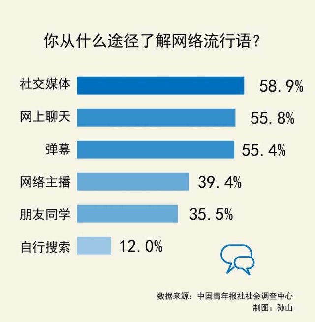 數(shù)據(jù)顯示,微博、小紅書、微信等社交媒體(58.9%)是受訪青年知曉網(wǎng)絡(luò)流行語(yǔ)的主要途徑。接下來(lái)是網(wǎng)上聊天(55.8%)、彈幕(55.4%)。其他還有:網(wǎng)絡(luò)主播(39.4%)、朋友同學(xué)(35.5%)和自行搜索(12.0%)等。
