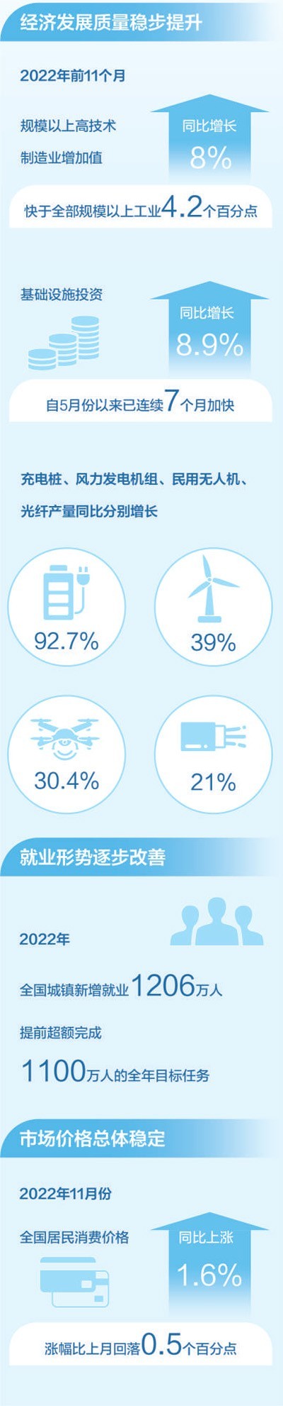 2022年,面對風(fēng)高浪急的國際環(huán)境和艱巨繁重的國內(nèi)改革發(fā)展穩(wěn)定任務(wù),我國經(jīng)濟穩(wěn)健發(fā)展,全年國內(nèi)生產(chǎn)總值預(yù)計超過120萬億元。看供給結(jié)構(gòu),產(chǎn)業(yè)升級發(fā)展持續(xù),新動能積蓄增強。2022年前11個月,規(guī)模以上高技術(shù)制造業(yè)增加值同比增長8%,快于全部規(guī)模以上工業(yè)4.2個百分點;看消費需求,線上消費需求釋放帶動作用明顯。前11個月,全國實物商品網(wǎng)上零售額同比增長6.4%,網(wǎng)絡(luò)購物帶動快遞等行業(yè)較快增長。