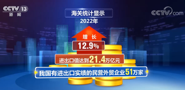 海關(guān)統(tǒng)計(jì)顯示,2022年,我國(guó)有進(jìn)出口實(shí)績(jī)的民營(yíng)外貿(mào)企業(yè)51萬(wàn)家,進(jìn)出口值達(dá)到21.4萬(wàn)億元,增長(zhǎng)12.9%。2022年,民營(yíng)企業(yè)進(jìn)出口規(guī)模所占比重達(dá)到了50.9%,較上年提高2.3個(gè)百分點(diǎn),對(duì)我國(guó)外貿(mào)增長(zhǎng)的貢獻(xiàn)率達(dá)80.8%。