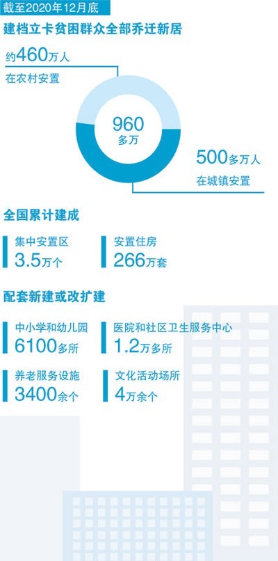 習(xí)近平總書記強(qiáng)調(diào):“易地搬遷是解決一方水土養(yǎng)不好一方人、實(shí)現(xiàn)貧困群眾跨越式發(fā)展的根本途徑,也是打贏脫貧攻堅(jiān)戰(zhàn)的重要途徑?!秉h的十八大以來,全國累計(jì)建成集中安置區(qū)3.5萬個(gè)、安置住房266萬套。到2020年底,全國易地扶貧搬遷規(guī)劃建設(shè)任務(wù)全面完成,近千萬生活在“一方水土難養(yǎng)一方人”地方的建檔立卡貧困人口實(shí)現(xiàn)易地扶貧搬遷,搬入新家園、開啟新生活。