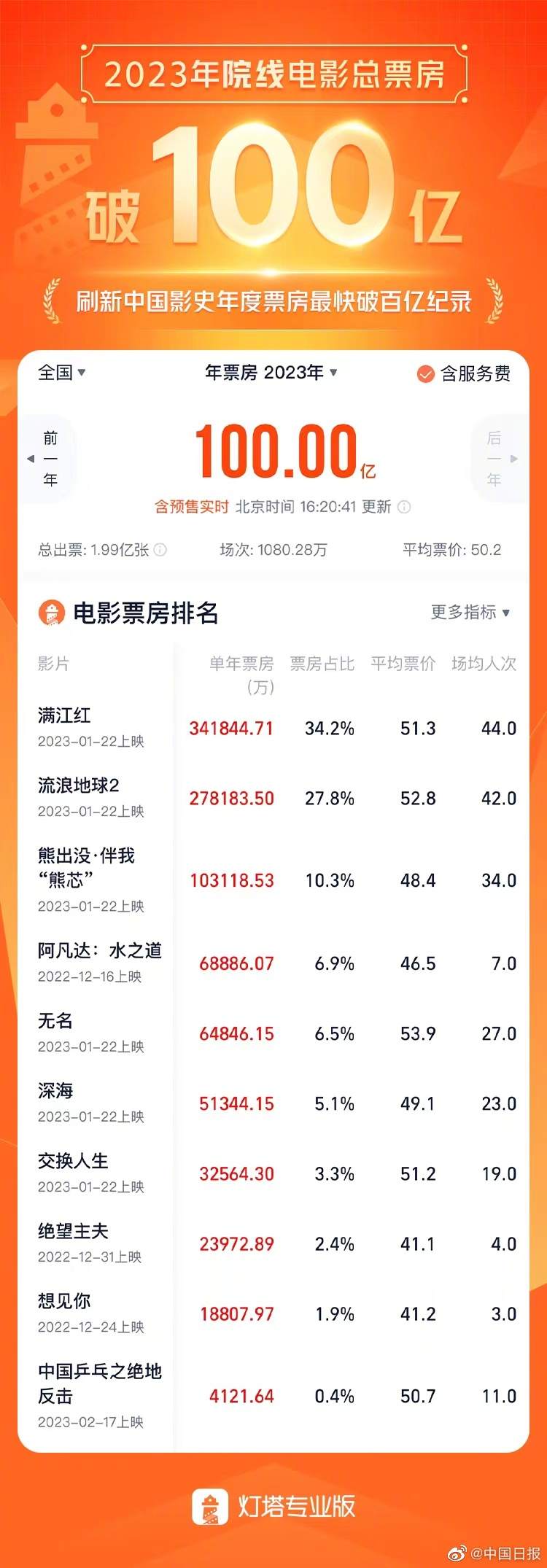 據(jù)燈塔專(zhuān)業(yè)版數(shù)據(jù),截至1月31日16時(shí)20分,2023年度大盤(pán)票房(含預(yù)售)突破100億,刷新中國(guó)電影市場(chǎng)年票房最快破100億紀(jì)錄。截至目前,2023年實(shí)時(shí)票房前三名分別為《滿(mǎn)江紅》《流浪地球2》《熊出沒(méi)·伴我“熊芯”》。(中新經(jīng)緯APP)