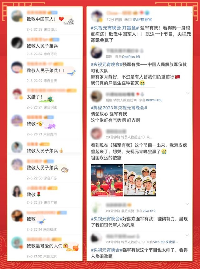 “請(qǐng)黨放心,強(qiáng)軍有我”“清澈的愛,獻(xiàn)給我的祖國”……聲聲誓言、字字鏗鏘。首次參加總臺(tái)元宵晚會(huì)的中國人民解放軍儀仗司禮大隊(duì)奏唱的歌曲《強(qiáng)軍有我》,不僅唱出中國軍人的拳拳赤子心,更唱出了“最可愛的人”那豪邁激情和磅礴氣勢。整齊劃一的動(dòng)作、堅(jiān)定有力的眼神讓無數(shù)網(wǎng)友直呼:“震撼!這就是中國排面”“為人民子弟兵熱淚盈眶”“致敬中國軍人!感謝你們?yōu)榇蠹邑?fù)重前行”。而網(wǎng)友們也用整齊一致的留言共同致敬“最可愛的人”。
