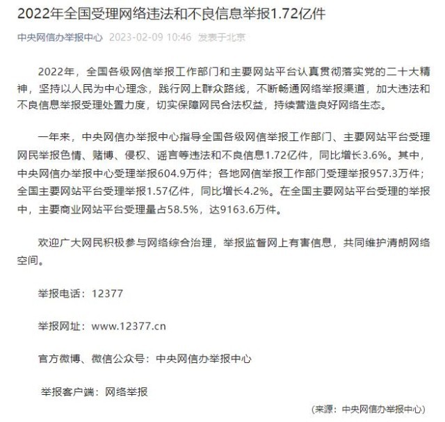 2022年全國受理網(wǎng)絡(luò)違法和不良信息舉報(bào)1.72億件