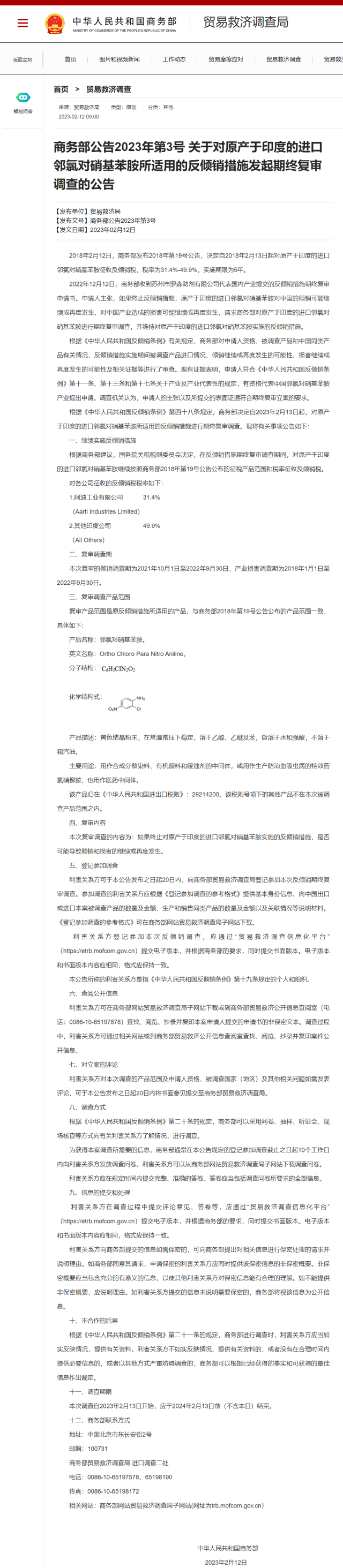 央視網(wǎng)消息:2月12日,商務(wù)部網(wǎng)站發(fā)布公告,決定自2023年2月13日起,對(duì)原產(chǎn)于印度的進(jìn)口鄰氯對(duì)硝基苯胺所適用的反傾銷(xiāo)措施進(jìn)行期終復(fù)審調(diào)查。根據(jù)商務(wù)部建議,國(guó)務(wù)院關(guān)稅稅則委員會(huì)決定,在反傾銷(xiāo)措施期終復(fù)審調(diào)查期間,對(duì)原產(chǎn)于印度的進(jìn)口鄰氯對(duì)硝基苯胺繼續(xù)按照商務(wù)部2018年第19號(hào)公告公布的征稅產(chǎn)品范圍和稅率征收反傾銷(xiāo)稅。