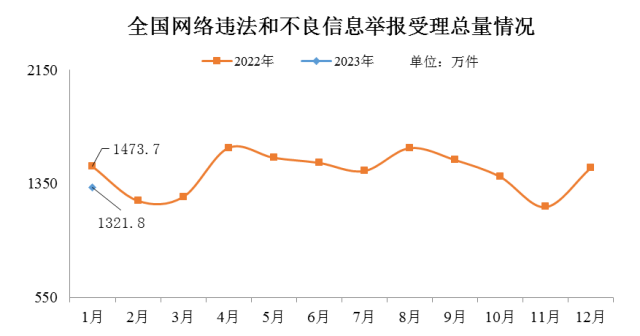 2023年1月全國(guó)受理網(wǎng)絡(luò)違法和不良信息舉報(bào)1321.8萬件